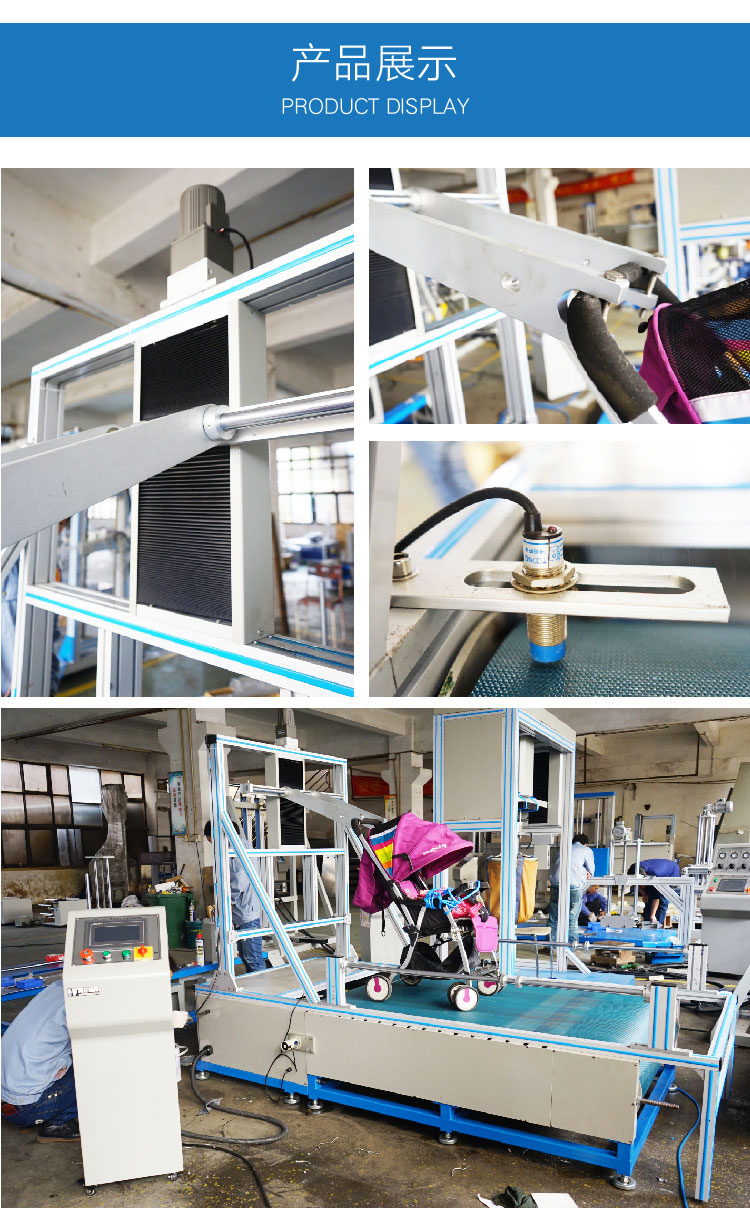 测试方法为:置模型婴儿于车台中,将车台固定于测试台上,调整输送带速度1.4±0.1m/sec(5kw/h±3.6 kw/h)。持续测试64小时后,目视车台有无损坏。达设定次数能自动停止操作。本机备有电眼安全装置,可防止因把手及橡胶束环断裂致使婴儿车失控损坏测试机。本机适用于手推式婴儿车模拟路况运动时底轮及车体之动态耐用性测试。