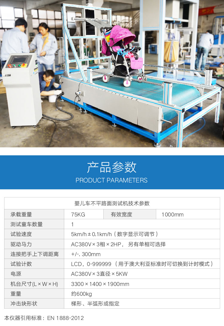 适用于婴儿车不平路面试验,可测得婴儿车轮子材料的耐磨性及整体结构有无磨损及变形,试验的结果可供作改进的参考。