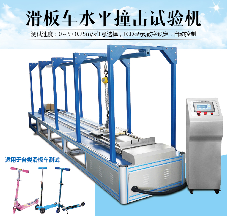 HD-AJ224滑板车水平撞击试验仪运用物体势能转化为动能的原理,将试样按预定位置起点滑至末端时获得一定的冲击速度与一个和速度方向垂直的冲击板碰撞,观察滑板车前轮损坏情况,达到试验目的。