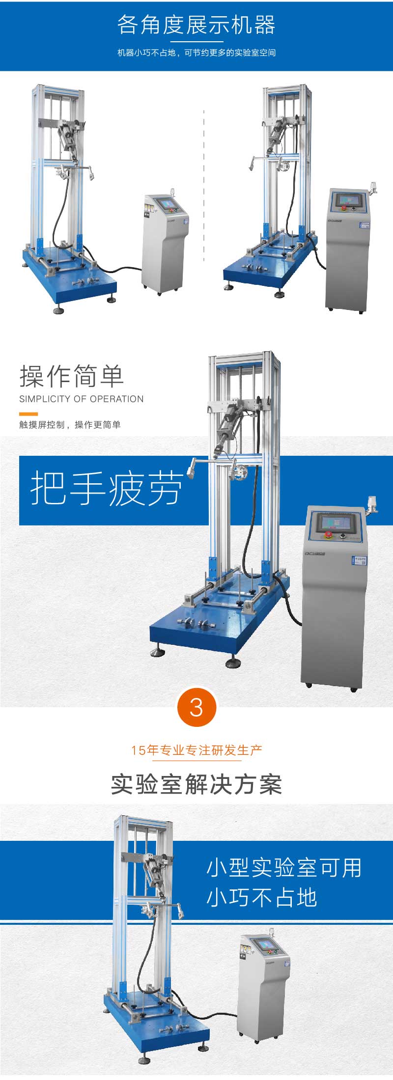 滑板车龙头手把杆疲劳试验机适用于前轮摇摆时对把手进行测试,如滑板车、童车、手推车的把手。滑板车在使用时,人对车把手会产生一个按压或拉伸的力,本仪器便是模拟这种循环拉压过程,来观察记录滑板车把手机械性能及整体结构的疲劳情况。